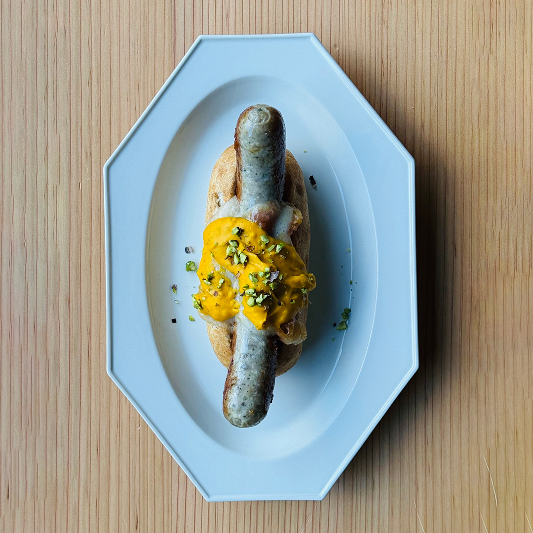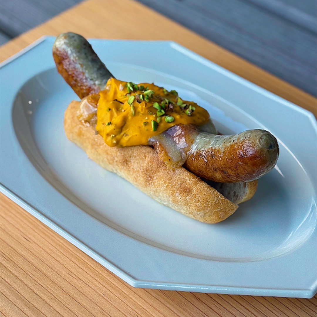 工房で手づくりされたソーセージを使ったホットドッグ