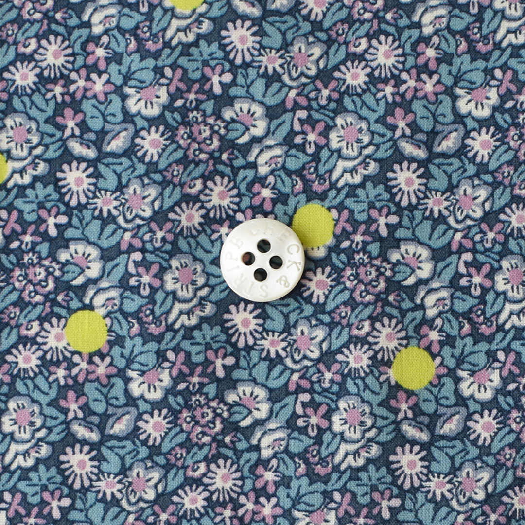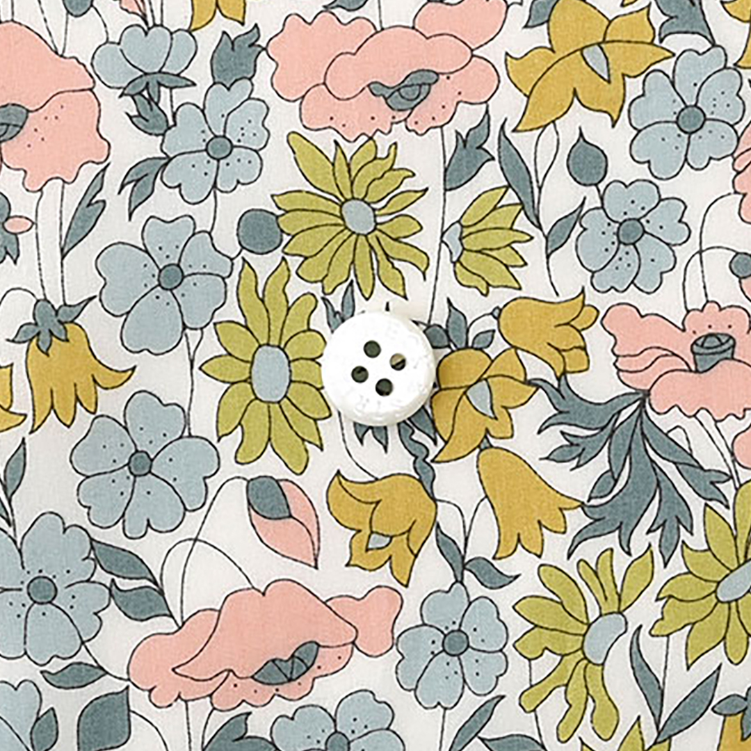オリジナルはリバティの1979年春夏コレクションで発表された緻密で小粋なボタニカルデザインで、ヒナギク、バラ、アサガオなど、さまざまな花がシームレスな多方向の草原をなしています。水玉模様の遊び心を加えて再構築されたこのデザインは、時代を超えて幅広く使え、遠くから見るとまるでテクスチャーのある素材のように見えます。